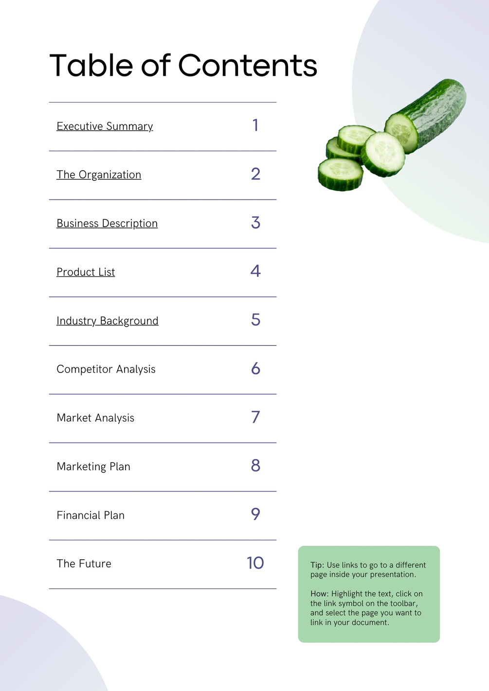 1️⃣ Executive Summary 2️⃣ The Organization 3️⃣ Business Description 4️⃣ Product List 5️⃣ Industry Background 6️⃣ Competitor Analysis 7️⃣ Market Analysis 8️⃣ Marketing Plan 9️⃣ Financial Plan 🔟 The Future