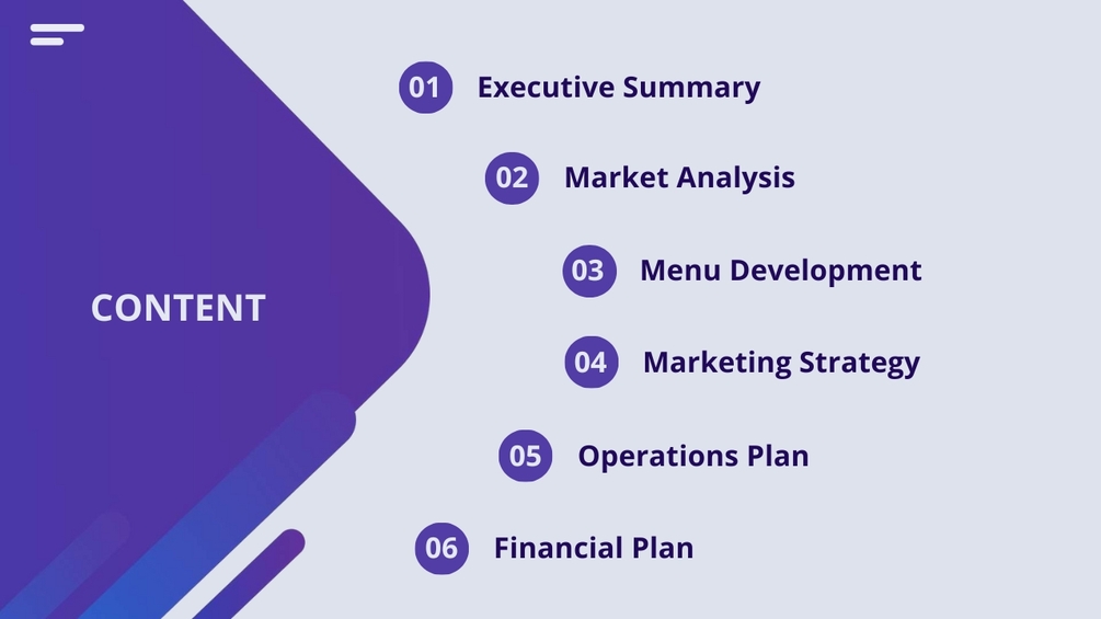 Executive Summary, Market Analysis, Menu Development, Marketing Strategy, Operations Plan, Financial Plan